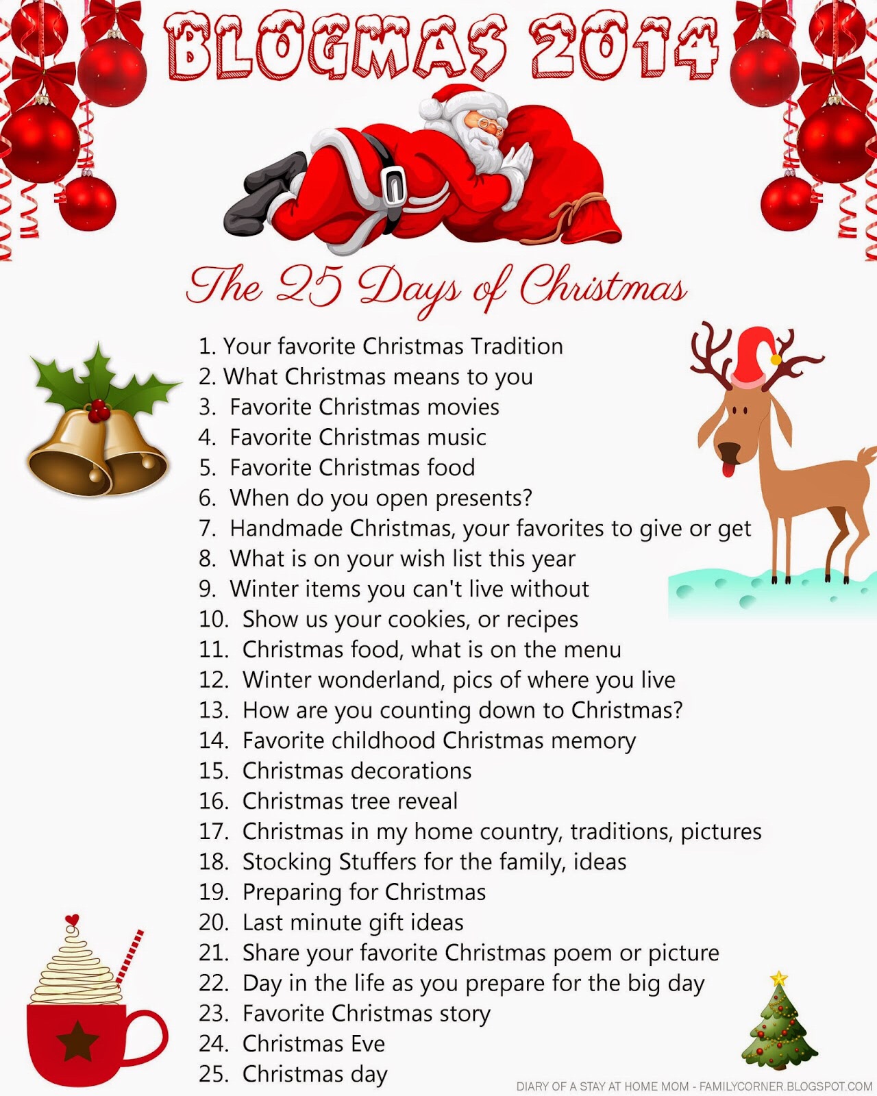 I’ve seen many people posting about blogmas, and I want to join in on the fun. I found an old post on Diary Of A Stay At Home Mom with a list of Blogmas posts that I’m going to use. The link is here https://familycorner.blogspot.ca/2014/11/blogmas-2014-25-days-of-christmas.html?m=1